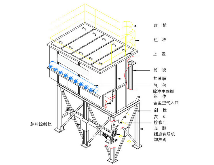4、噴吹系統:由控制儀、控制閥、電磁脈沖閥、噴吹管、氣包和防護裝制組成;