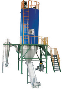 潔凈空氣加熱后進入干燥塔,在塔內熱風中用二流體(或三流體)噴嘴將各種料液物化成微小液滴,與熱風進行快速熱交換,蒸發掉液料中的水份(或溶劑),并隨熱風排出,得到粉狀產品。