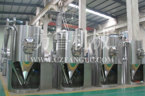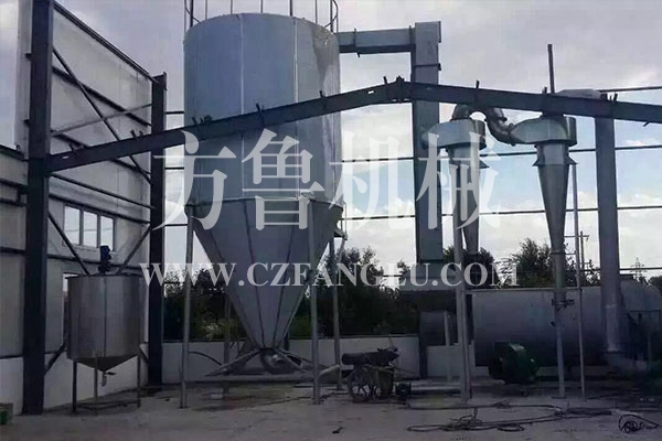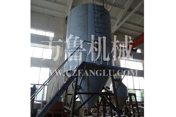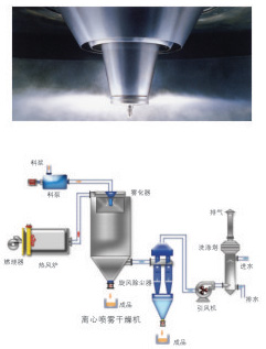 空氣經過過濾和加熱,進入干燥器頂部空氣分配器,熱空氣呈螺旋狀均勻地進入干燥室。料液經塔體頂部的高速離心霧化器,(旋轉)噴霧成極細微的霧狀液珠,與熱空氣并流接觸,在極短的時間內可干燥為成品。成品連續地由干燥塔底部和旋風分離器中輸出,廢氣由風機排空。